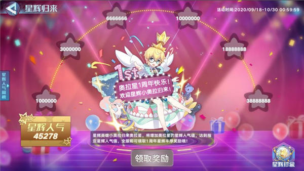 活动内容:星辉归来活动正式开启,星辉英雄小奥拉的回归,将增加奥拉星的星辉人气值,达到指定星辉人气值,全服即可领取1周年星辉丰厚奖励哦!激活星辉英雄徽章的小奥拉收到来自小奥拉送上的鲜花,达到个人指定星辉人气值,还可以上榜星辉人气榜哦!