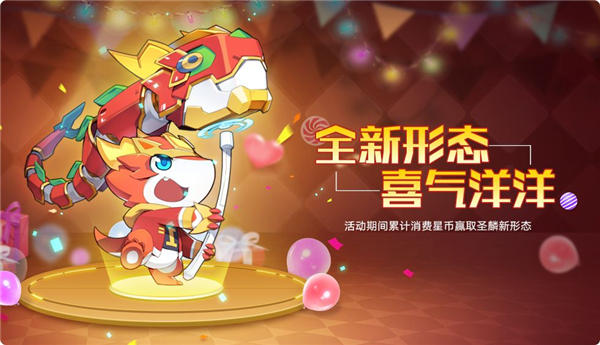 形态获得:在活动圣麟生日礼物中,活动期间累计消耗星币即可获得星之钥道具,使用星之钥打开礼盒即有机会获得圣王麒麟最新形态——喜气洋洋。