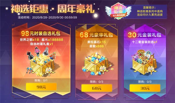 活动内容:神选钜惠时装自选礼包正式上架,98元礼包内含188888星光,18世界之钥,以及自选时装礼盒,小奥拉可以从四套精美绝版套装中自选获得一套,奖励丰厚,快来入手吧~~
