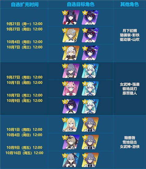 9月21日12:00~10月16日12:00期间,还将开启六期自选扩充补给。(此期间内,常规扩充补给将暂时关闭)。每期都会有三位S级女武神加入自选扩充补给,获取概率提升!舰长可以根据自身需要,任选其中一位S级女武神作为当期UP目标。
