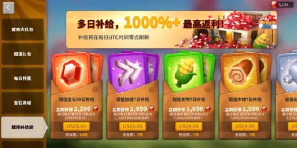 微氪玩家可以选择做月卡党或基金党,月卡党指在城市补给站可购买超值30日宝石补给,不仅可以立刻获得2200宝石,之后每天登录还能获得650宝石。