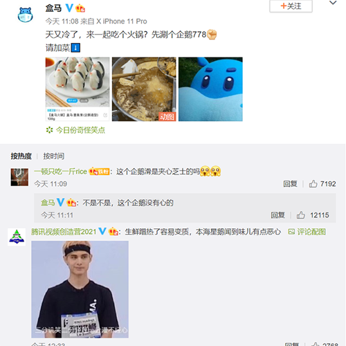 因为在今年的《创造营》综艺节目中人气选手和马称因为家庭原因不得不退赛,但是网友们觉得有黑幕,但是没有发表言论,后与和马谐音的“盒马”官方又在中发了刷个企鹅77的微博,后还在回复网友的评论中调侃说“这个企鹅没有心”。然后腾讯视频创造营的官方直接发微博开撕。