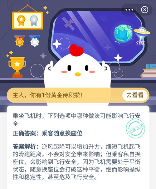 以上就是关于乘坐飞机时,下面选项中哪种做法可能影响飞行安全?这个问题的正确答案,小伙伴们知道之后千万不要在坐飞机的时候来回更换位置哦。更多关于支付蚂蚁庄园题目的正确答案,赶紧来关注沙包手游吧。