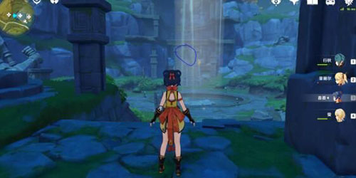 4、先来到青墟浦右下方璃沙郊传送点,准备好岩元素角色,从传送点飞到图中圈出位置,从图中石门穿过。