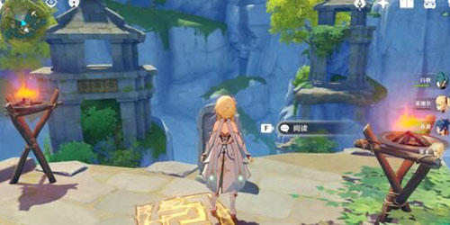 5、先和石碑对话,然后用岩元素点亮图中的那个发光标记 (图中为已经点亮的),点亮5个标志后会在石碑前刷出宝箱,抬头前方两座塔,可以从图中看到两个发光的黄点,同样岩元素点亮 然后回到图中位置,回头看到如图位置有座塔 顶层另外一个标志。