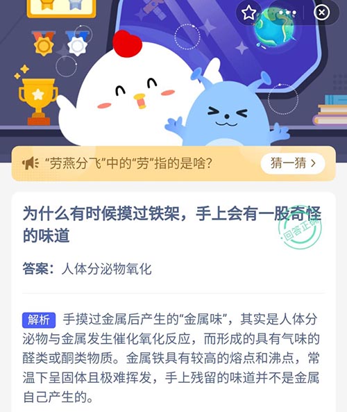 为什么有时候摸过铁架手上会有一股奇怪的味道 支付宝蚂蚁庄园10月29日答案