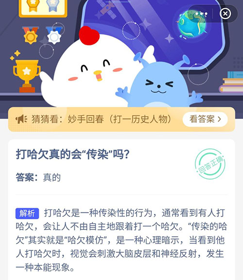 打哈欠真的会传染吗 支付宝蚂蚁庄园5月11日答案