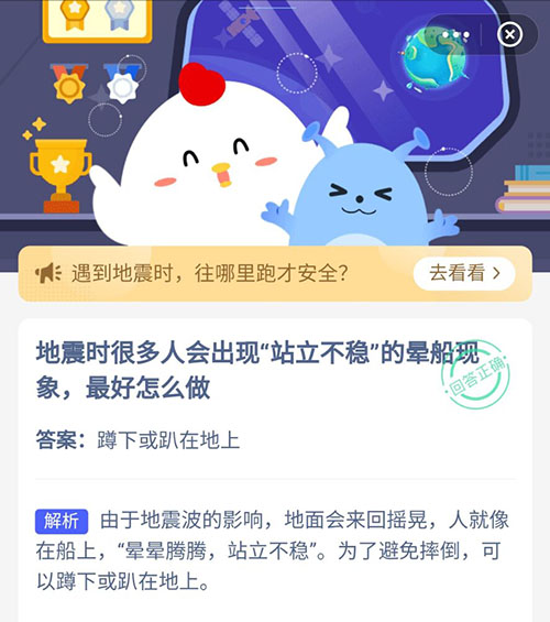地震时很多人会出现站立不稳的晕船现象最好怎么做 支付宝蚂蚁庄园5月12日答案