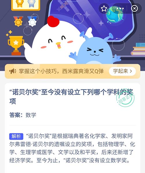 诺贝尔奖没有设立哪个学科奖项 支付宝蚂蚁庄园10月21日答案