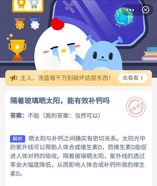 隔着玻璃晒太阳能有效补钙吗 支付宝蚂蚁庄园4月25日答案