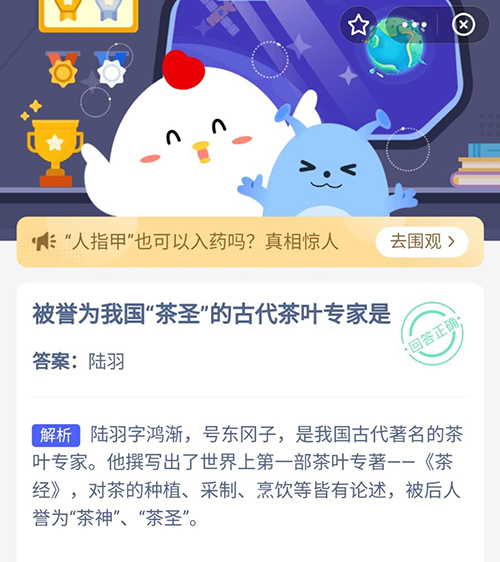 被誉为我国茶圣的古代茶叶专家是 支付宝蚂蚁庄园11月4日答案