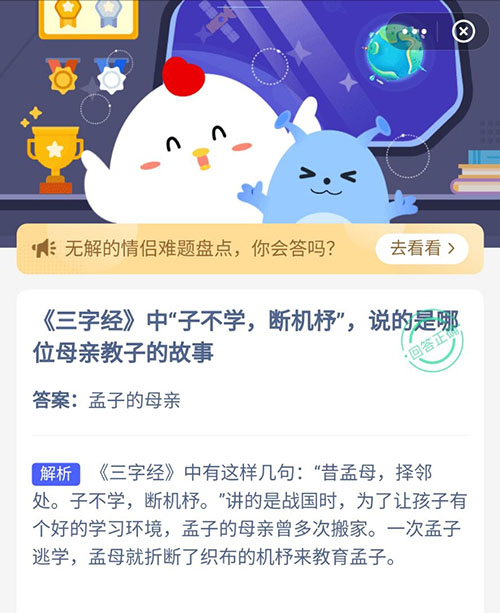 三字经中子不学断机杼说的是哪位母亲教子的故事 支付宝蚂蚁庄园5月28日答案
