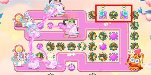 8.第五波将场上剩余道具全部拆除成功,在下图两个位置处放置泡泡塔,延缓敌人的速度;