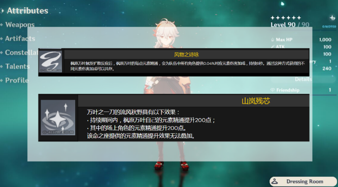 万叶2命时,释放元素爆发后,效果持续期间,万叶获得200精通,并且场上角色会获得额外的200精通(注:该效果无法叠加)。有些类似六命迪奥娜的大招元素精通增幅,不过没有那么多限制条件。
