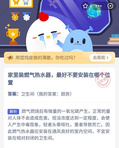 家里装燃气热水器最好不要安装在哪个位置 支付宝蚂蚁庄园10月18日答案