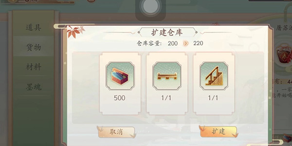 5.料齐全的情况下,点击扩建就可以升级仓库容量了。
