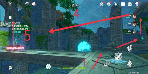 5.朝底部走,底部有挑战。首先朝1处关闭风场,再逆时针如箭头所示收集,挑战完成后改变风场向上飞。