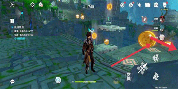 4.清理怪物后,记得回头拿风循币!如箭头所示依次将风场朝上,打开机关,解锁第五处风场。