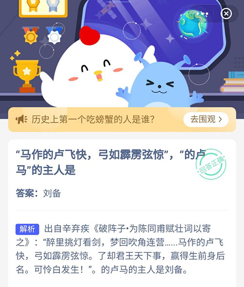 以上就是的卢马的主人是谁?这个问题的正确答案了,知道答案之后就可以领取属于自己的小鸡饲料了,每天都会支付宝小鸡答题的正确答案为你提供,赶紧来关注沙包手游,获取明天的正确答案。
