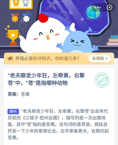 老夫聊发少年狂左牵黄右擎苍中苍指哪种动物 支付宝蚂蚁庄园4月30日答案