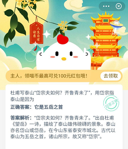 杜甫写泰山岱宗夫如何岱宗指泰山是因为什么 支付宝蚂蚁庄园11月4日答案