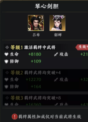 3个羁绊都可以为吕布加不少的属性(随着突破等级上升而增加)其中优先选择貂蝉,其次张辽,然后华雄。两者前的属性都可以为吕布增加最高的属性!