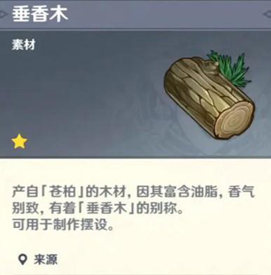 垂香木产自苍柏的木材,因其富含油脂,香气别致,有着垂香木的别称。而垂香木主要就是用来制作摆设的原材料。也是我们即将上线的家园系统中的重要制作材料。想要获得垂香木的话,我们需要在大世界中找到苍柏这种树木,然后直接进行砍伐就有几率获得垂香木了。在我们探索大世界的过程中,如果找到了苍柏,直接使用攻击就可以砍伐树木了。