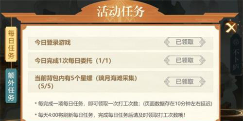 1、每日任务将于每天4:00刷新,完成每日任务后请及时领取打工次数;