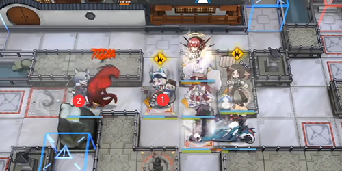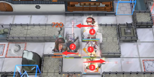 接下来等到得意和先锋接触后,部署法系近卫输出。左边“妒”登场后如下图所示用砾卡住,让能天使过载解决(解决后撤退砾)。