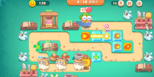 1、第一波可以在最下面建个一级风扇,可以帮忙减速+随机打机关,很好用。在右边位置放火炮清理障碍,障碍清除后建新火炮,这个时候专心清障碍;