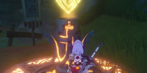 之后玩家点燃湖边的火把,上楼梯,在把山坡上的火把点燃,然后是草坪上的火把,之后把岩柱旁边的火把点燃,再用岩元素把中间的岩柱激活,大家注意要带岩元素的角色哦,然后就可以开启无妄引咎密宫了。