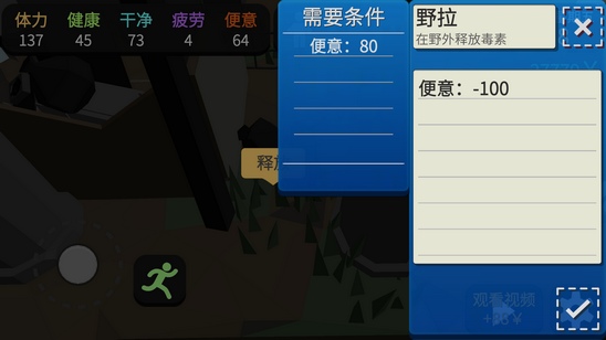 在我们购买房子前,我们可以通过野外释放来降低便意。地点在在出生地破房子后面和墓碑右边树下那里可以解决,租房后买马桶,使用后也能降低!