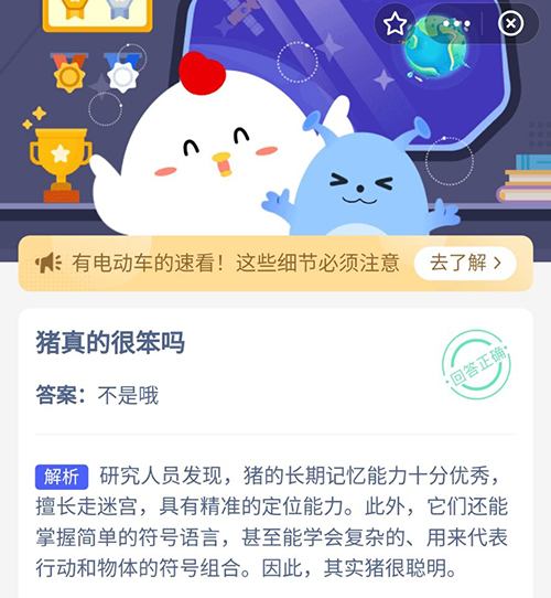 以上就是关于猪真的很笨吗这个问题的正确答案,得到正确答案的小伙伴赶紧去领取自己的小鸡饲料吧,明天也会持续为你更新,为你带来支付宝蚂蚁庄园中的正确答案。