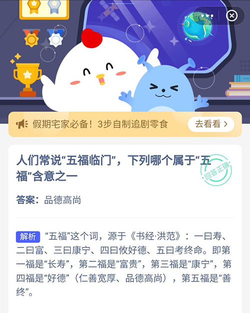 人们常说的五福临门下列哪个属于五福含意之一 支付宝蚂蚁庄园6月11日答案