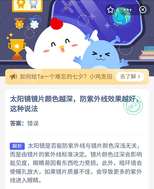 太阳镜镜片颜色越深防紫外线效果越好这种说法 支付宝蚂蚁庄园8月13日答案
