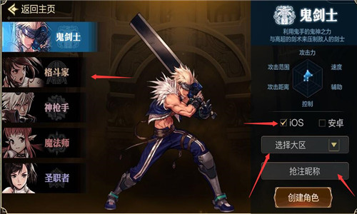 4、点击自己想要的角色,确定收集系统,选择区域以及抢注昵称。最后点击创建角色就可以了。