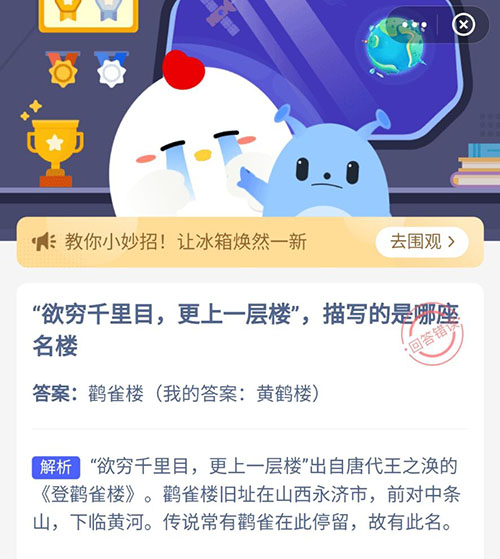 欲穷千里目更上一层楼描写的是哪座名楼 支付宝蚂蚁庄园7月1日答案