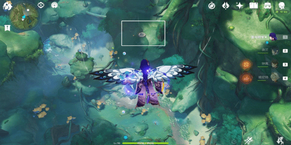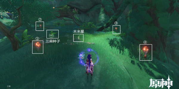3、在最左边的上面和下面等“三乘种子”接近,三乘种子接近后用雷元素攻击就可以看到火把了。