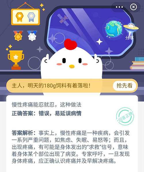 以上就是关于慢性疼痛能忍就忍着,这种做法是正确还是错误问题的答案,小伙伴们遇见疼痛一定要重视起来哦,支付宝的小鸡答题也会为小伙伴带来多个领域的提问,想知道更多正确答案,赶紧来关注沙包手游吧。