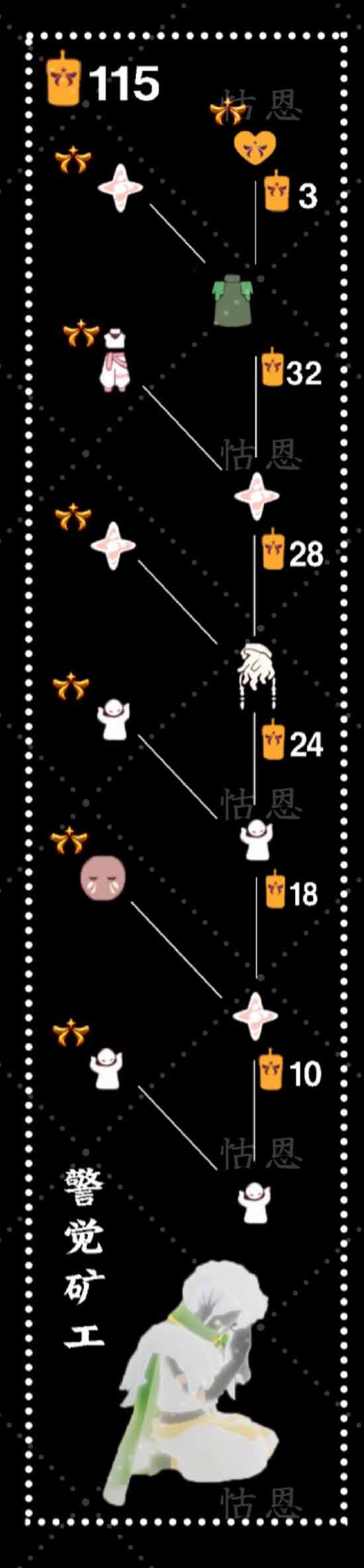 也可以直接前往霞谷 - 竞技场地图,先祖位置位于中间看台过道处,是竞技场与圆梦村地图连接入口的右手边一样的看台处,季节向导左手边第二个即警觉矿工先祖。