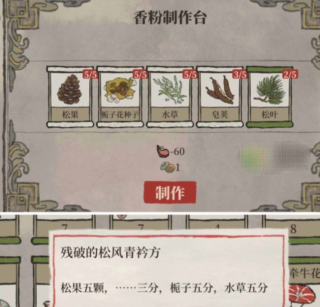 3、松风青衿=松果*5+皂荚*3+栀子花种子*5+水草*5