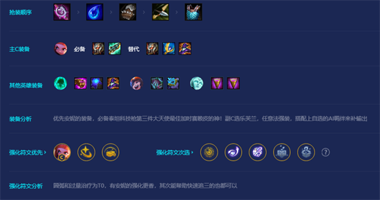 优先安妮的装备,必备泰坦科技枪第三件大天使最佳加时赛赖皮的神!副C选乐芙兰,任意法强装,搭配上自选的AI羁绊来补输出