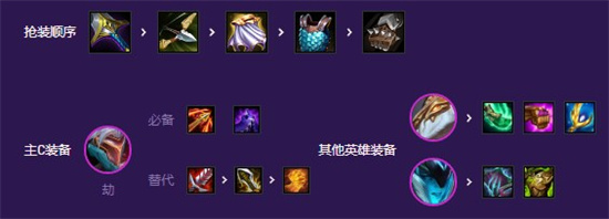 前期用3源计划2情报寒冰过渡,带劫的装备打工。5人口补亚索开3源计划,或者补琴女开3地下魔盗团贪霞奖励。可以用这套阵容一直过渡到7人口。