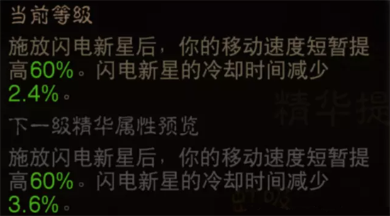 利用副手虹吸的加速效果在爬塔中拉扯敌人,每次打出闪电新星之后我们都有一个短暂提高移动速度加成的效果,利用这个机动性能力,我们代替了传送,让法师4个技能都做输出技能,把瞬间爆发和持续伤害拉满。闪电新星释放后你的移动速度短暂提高60%,闪电新星的冷却时间减少2.4%,因为精华升级提高了属性(正常应该是2%)