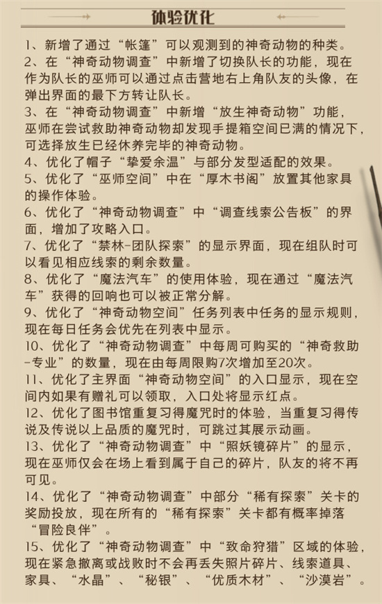 14、优化了“神奇动物调查”中部分“稀有探索”关卡的奖励投放,现在所有的“稀有探索”关卡都有概率掉落“冒险良伴”。
