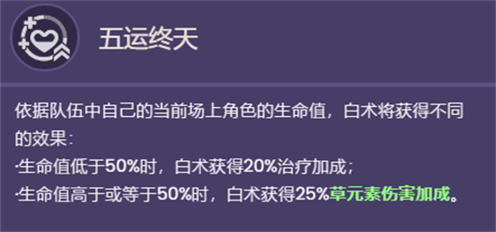 ·生命值高于或等于50%时,白术获得25%草元素伤害加成。