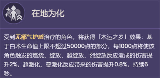 受到无郤气护盾治疗的角色,将获得「木运之岁」效果:基于白术生命值上限不超过50000点的部分,每1000点将使该角色触发的燃烧、绽放、超绽放、烈绽放反应造成的伤害提升2%,超激化、蔓激化反应带来的伤害提升0.8%,持续6秒。