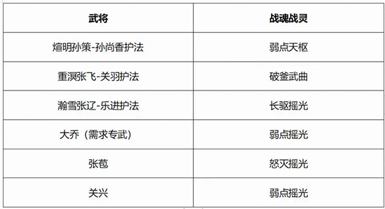 武将:煊明孙策-孙尚香护法、重溟张飞-关羽护法、瀚雪张辽-乐进护法、大乔(需求专武)、张苞、关兴