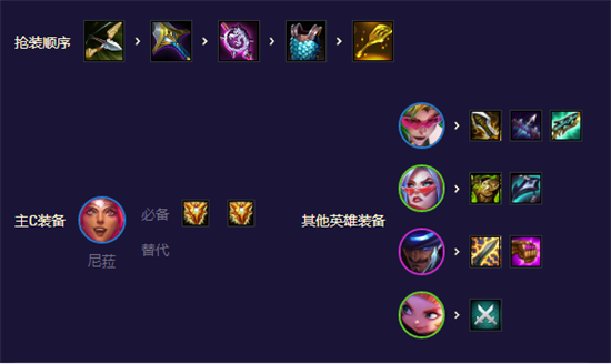 决斗阵容输出高,鸟盾是最合适的肉装,优先鸟盾,其他看着搭配。如果野怪都爆肉装,剑姬装备好,那也可以不管鸟盾去拿输出装。