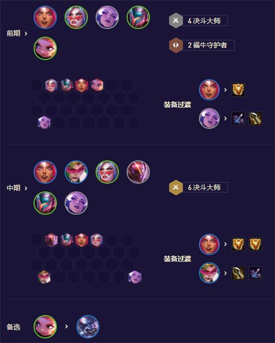 三阶段一般3-2六人口搜一波,把低费全升两星,然后四阶段4-2上7,把三费卡和六决斗凑出来全两星,然后根据实战情况追三星或者上八人口搜高费卡补羁绊。